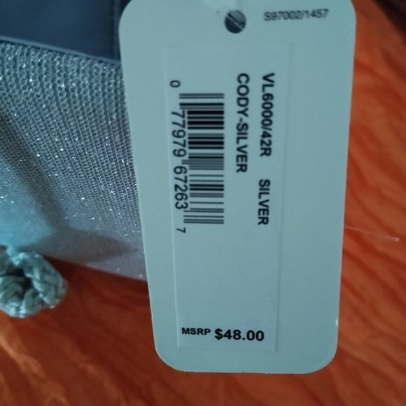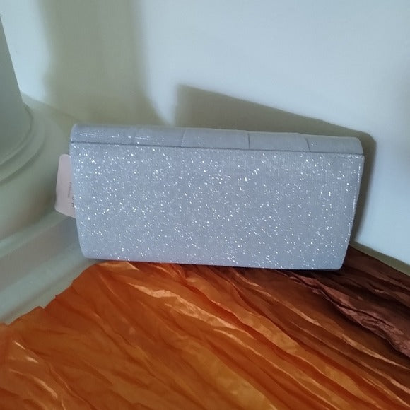 Pleated Silver metallic front designNice sized clutchIncludes chain link strap and cord strap.