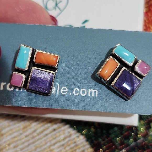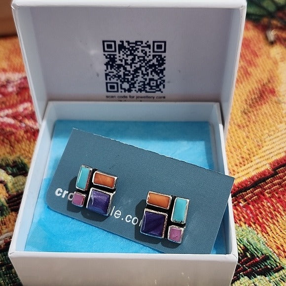 Sleveen - Rectangle With Multi-Coloured Mosaic Resin Silver Earrings - Stud Curated and designed by Emilio Sotelo Jewelry for Croi Kinsale Jewellery in Kinsale West Cork Ireland Europe. Handcrafted Silver jewelry.