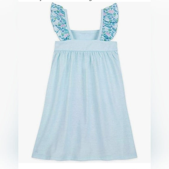 Squared neckline, flutter sleeves with floral pattern, and picot trim