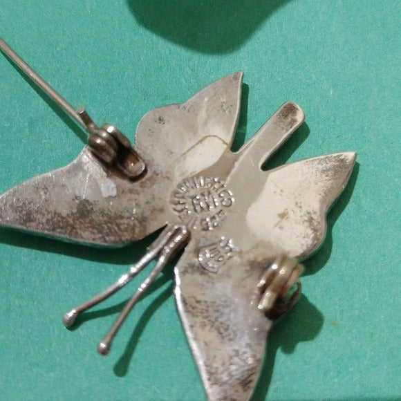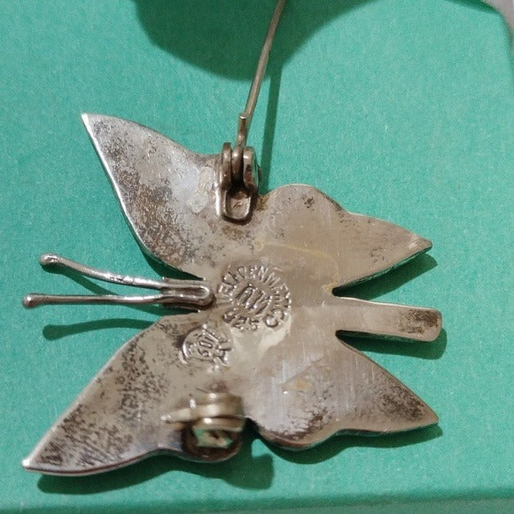 Elegant silver butterfly brooch featuring iridescent accents made of Abalone shell. Perfect for adding a touch of elegance to any outfit. This brooch has multiple Hallmarks. a circular Hechi en Mexico with AM in the center, 925 a long the circle and a separate smaller mark that resembles an eagle with 109 in the body.