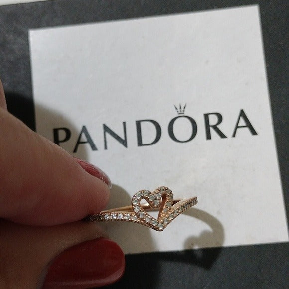 Gift the one you love the Sparkling Wishbone Heart Ring. Hand-finished in Pandora Rose™ (14k rose gold-plated unique metal blend), this piece is inspired by iconic design elements from Pandora Wish. The collection's iconic V-shape has been incorporated into the heart detail to create a fluid design. Clear cubic zirconia decorate the heart and top of the ring shank. Present this style to someone special to show how much you care.
