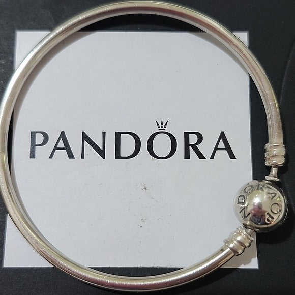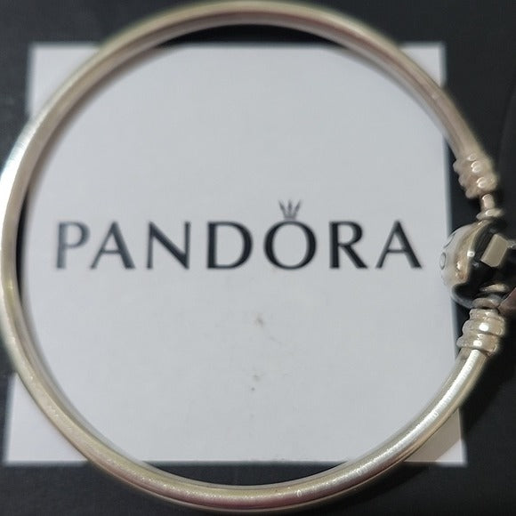 Sleek and elegant, this Pandora Moments bangle is simply beautiful. Crafted in polished sterling silver, it is finished with an embossed ball clasp. Wear this Pandora bangle on its own or create your dream bracelet by adding your personal collection of Moments charms.