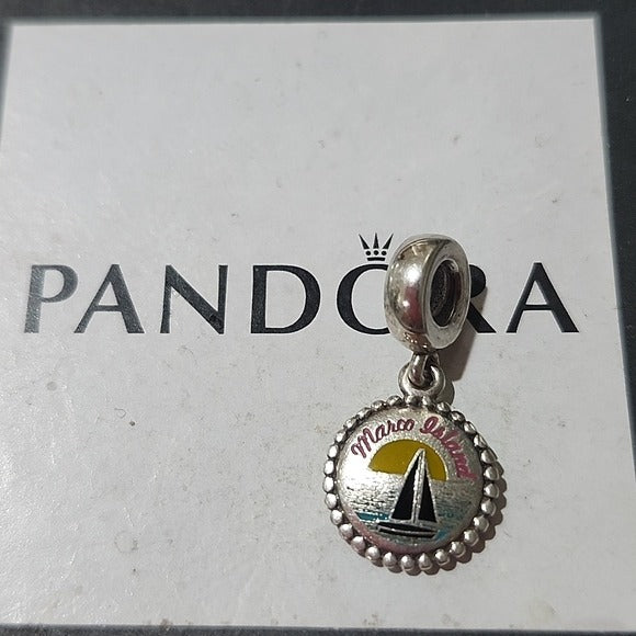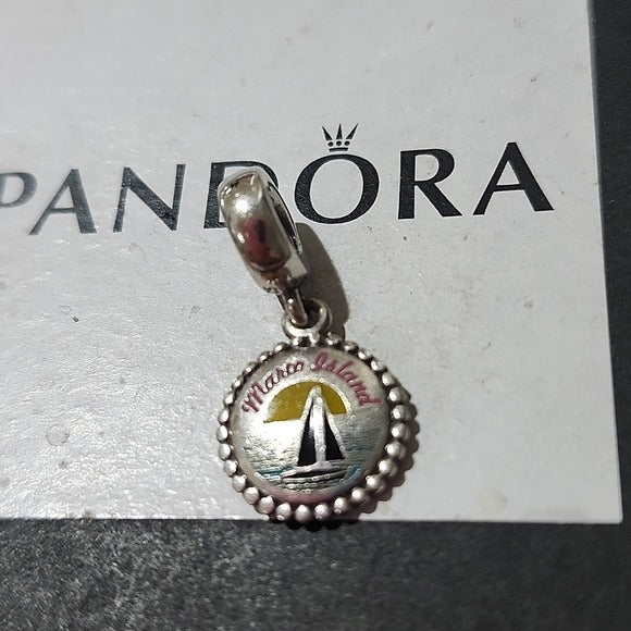 Elegant silver charm featuring a sailboat. Accented with pink, yellow, and blue details.