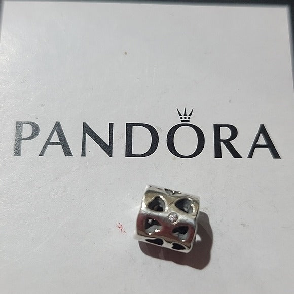 This barrel-shaped, sterling silver charm has hearts cut out of it, and is highlighted with various sparkling clear zirconia.