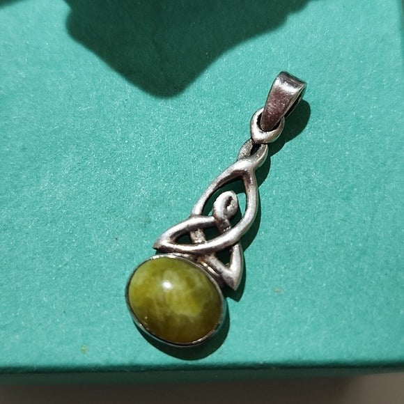 This is a Connemara marble pendant featuring a Celtic knot design.
