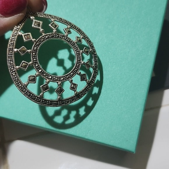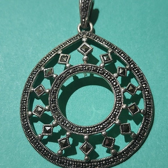 The pendant is a marcasite pendant, made of sterling silver. Marcasite jewelry features small, faceted pieces of pyrite (a type of iron sulfide) set into silver to create a sparkling, intricate design. The style is often associated with vintage or Art Deco periods. The pendant's openwork, circular shape is also a common design element, with the circle often symbolizing eternity or unity.