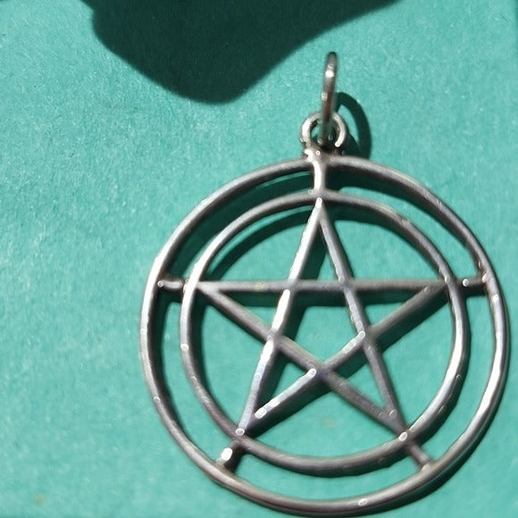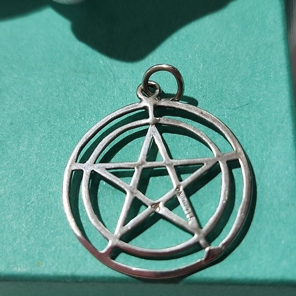 Crafted of fine sterling silver, this 5 pointed pentacle pendant presents an outer border encircling the first circle, with fine delicate lines. 1 1/4" Marked Sterling with an additional unknown hallmark.