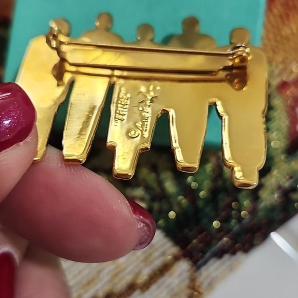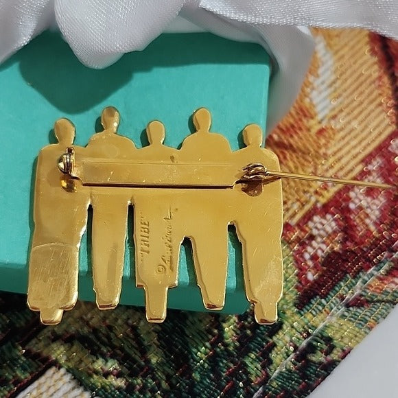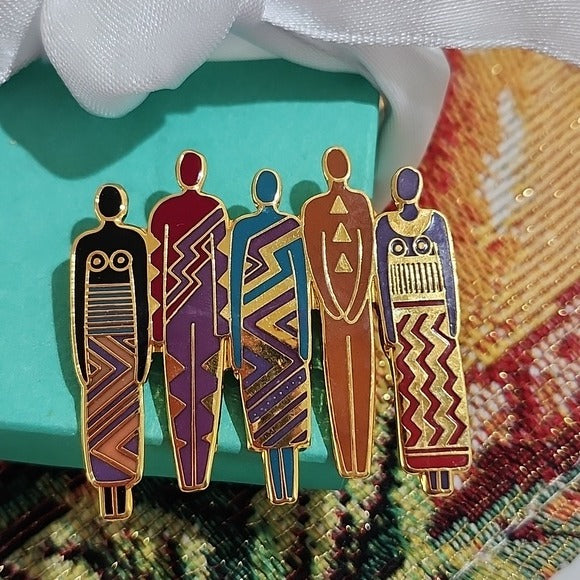 This is a Laurel Burch "Tribe" brooch pin, also known as the "Tribe People" brooch. The pin features five stylized tribal figures in gold-tone metal with colorful enamel in various patterns. The piece is often signed "Laurel Burch" and "TRIBE" on the back.